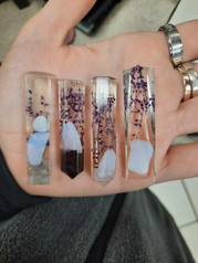 Contact via Facebook or Instagram to get a custom piece! All orders can be made with an assortment of crystals, dried flowers, metals, stickers, pictures, or other materials. She also works with cremation ashes for loved ones that have passed away. Takes custom orders on any of the following products: